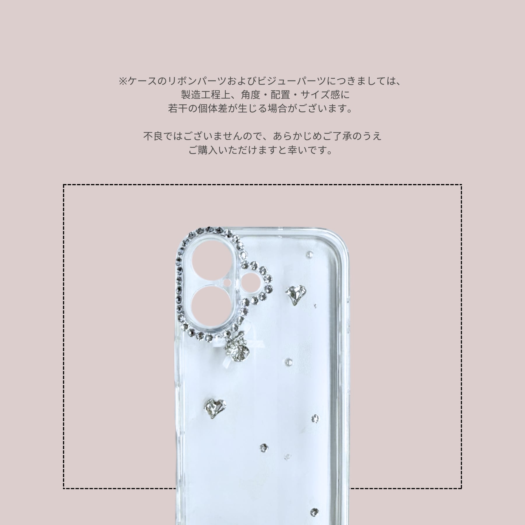 ※ケースのリボンパーツおよびビジューパーツにつきましては、製造工程上、角度・配置・サイズ感に若干の個体差が生じる場合がございます。不良ではございませんので、あらかじめご了承のうえご購入いただけますと幸いです。