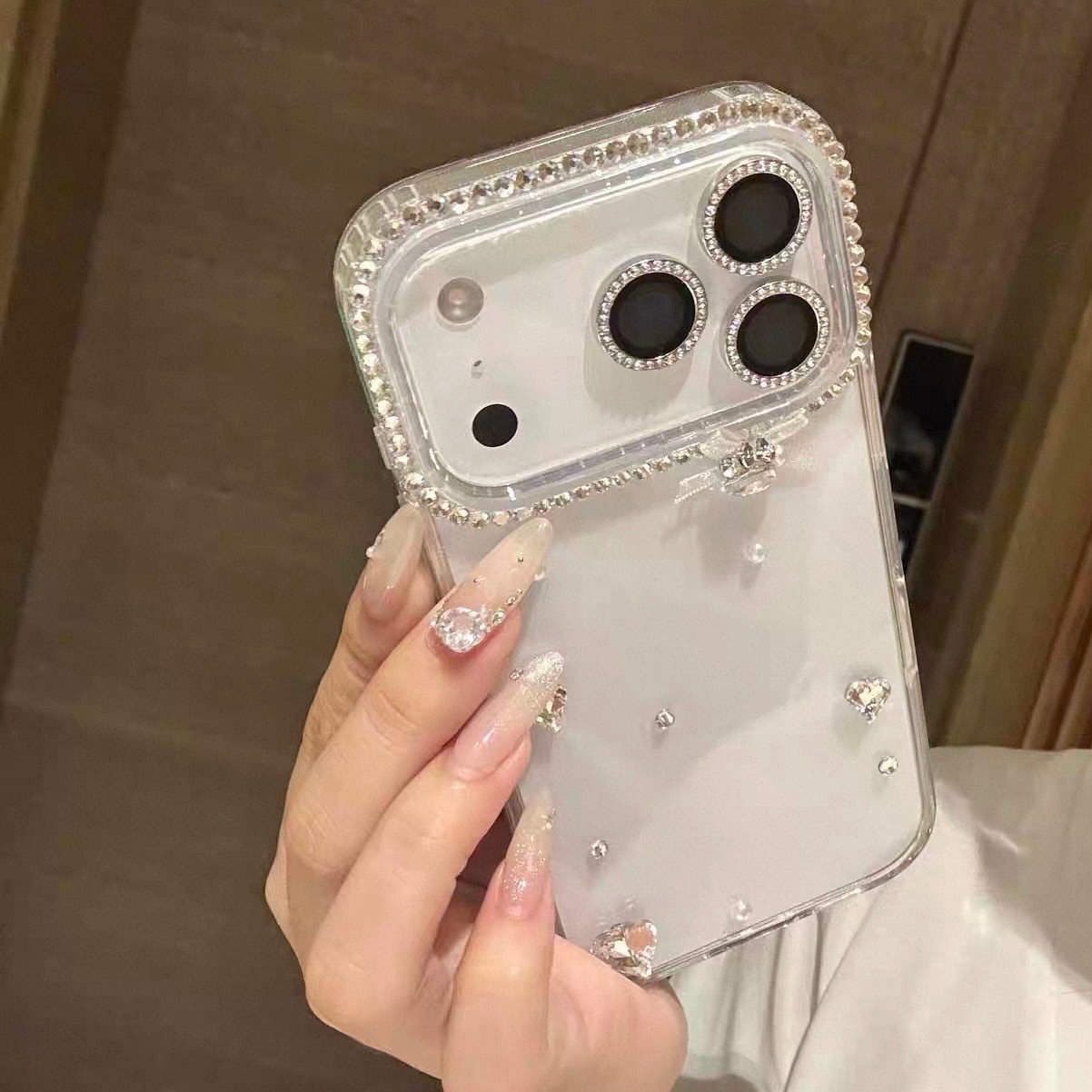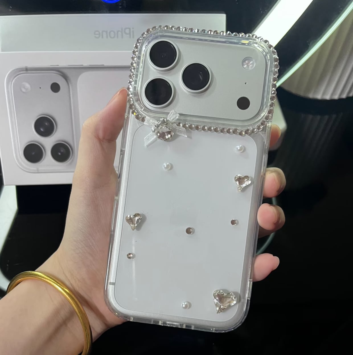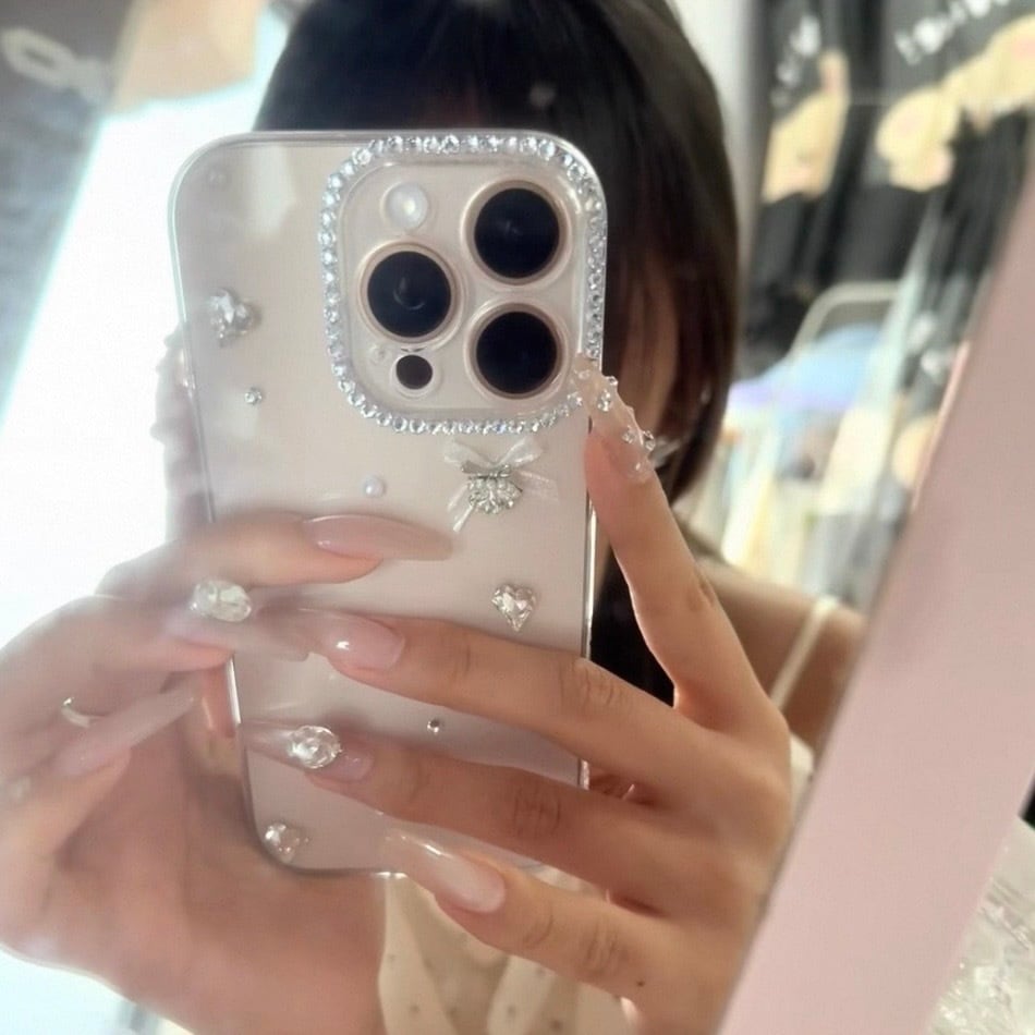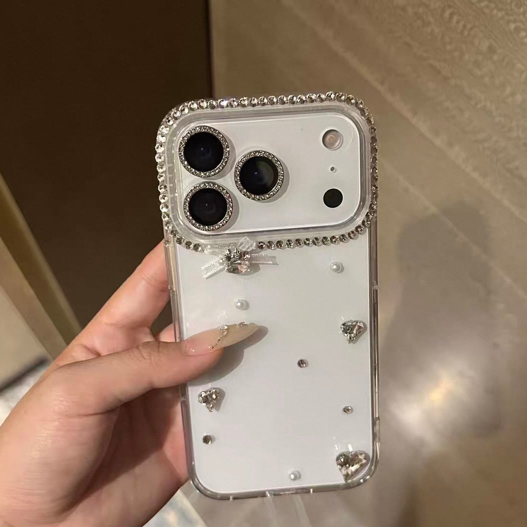 透明感のあるクリアベースに、ビジューやリボン、パールを散りばめた上品でガーリーなデザイン。カメラまわりのラインストーンが、華やかさを添えてくれます。