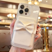 透明感のあるクリアケースに、ふっくらとした立体リボンが印象的なカードウォレットを組み合わせ。