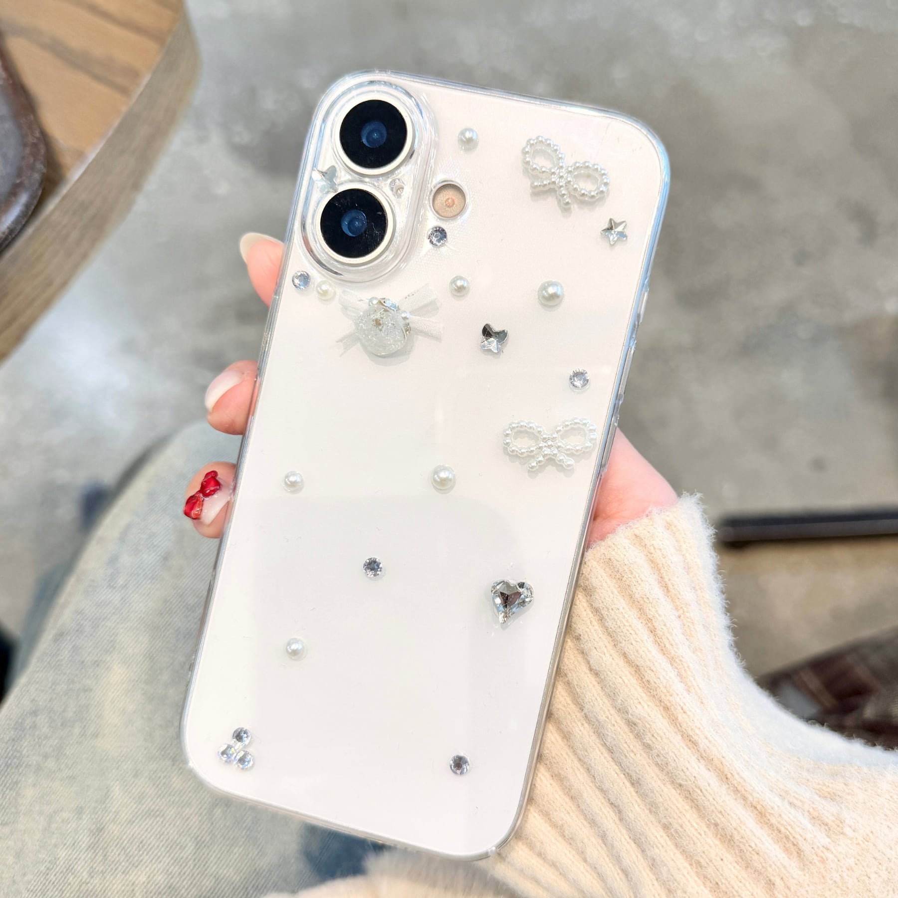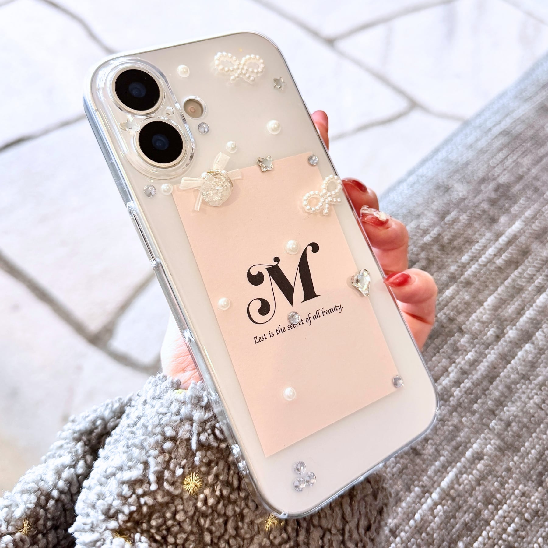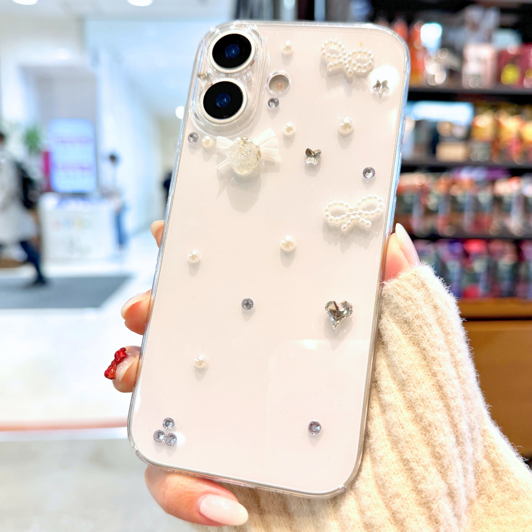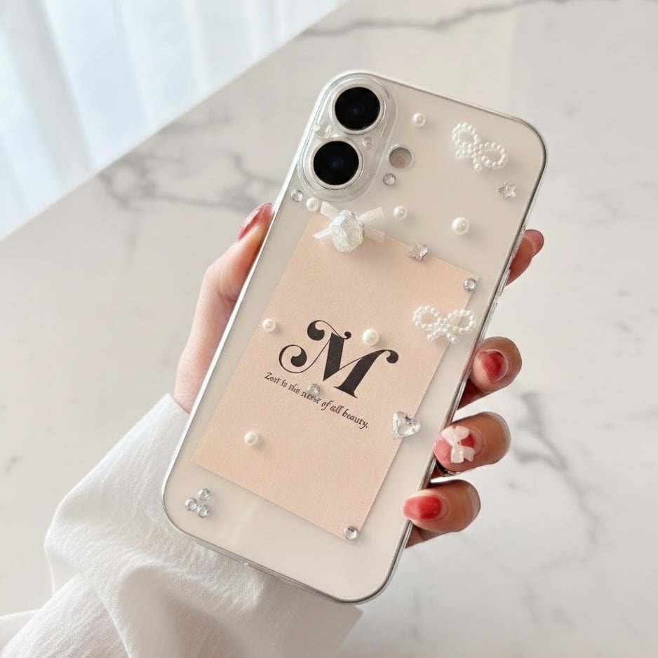 小さなビジューやパールを散りばめた、「ペタルビジューリボン iPhoneケース」。