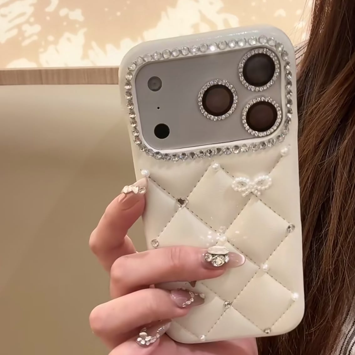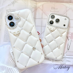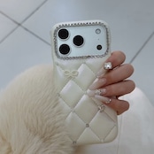 高級感のあるキルティングデザインに、繊細なビジューやパール、リボン・ハートモチーフをあしらった甘さと大人っぽさのバランスが絶妙なiPhoneケース。