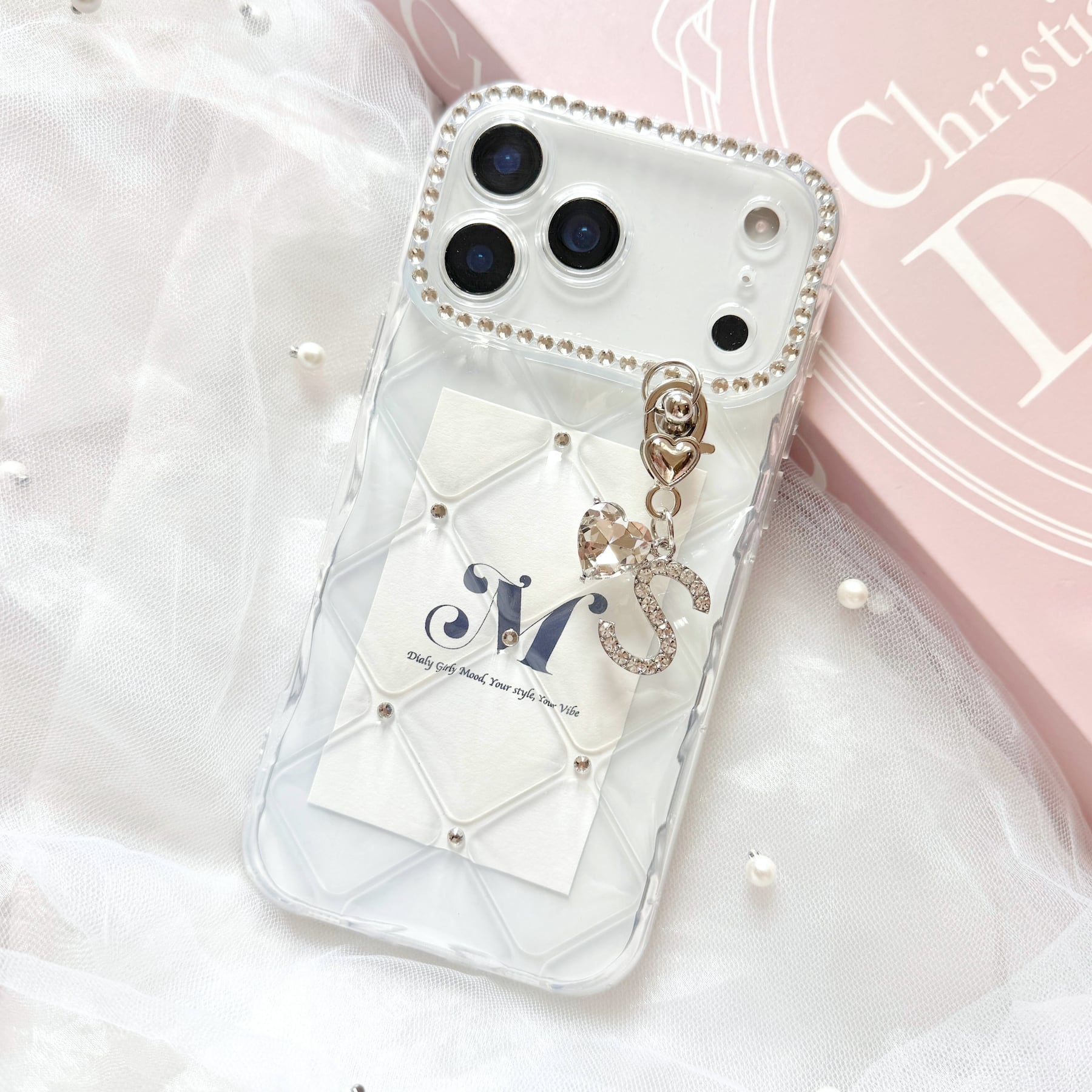 ハートビジューチャームとイニシャルパーツを組み合わせた、特別感のあるデザイン。自分用にはもちろん、ギフトにもおすすめです。