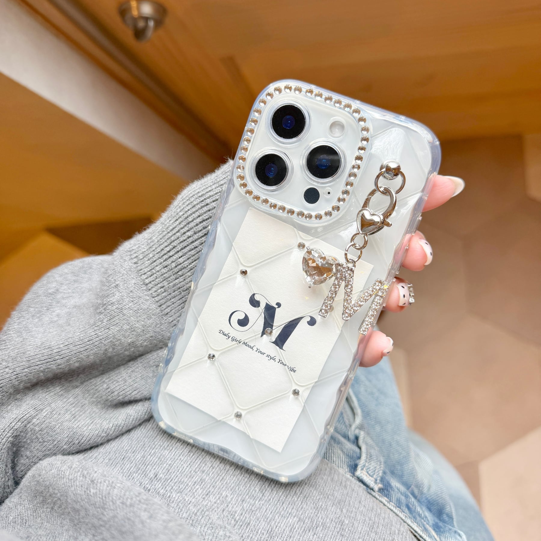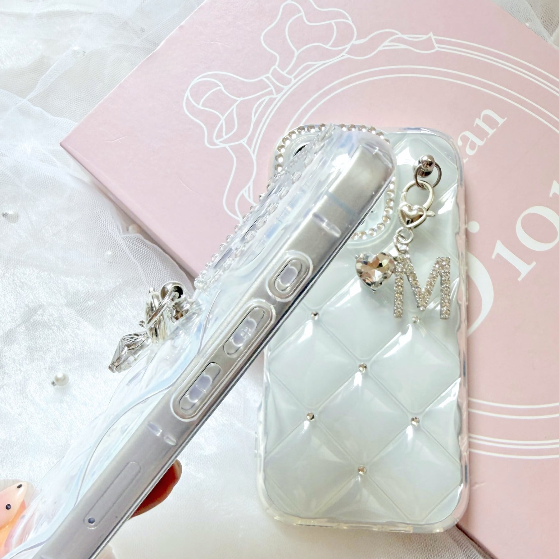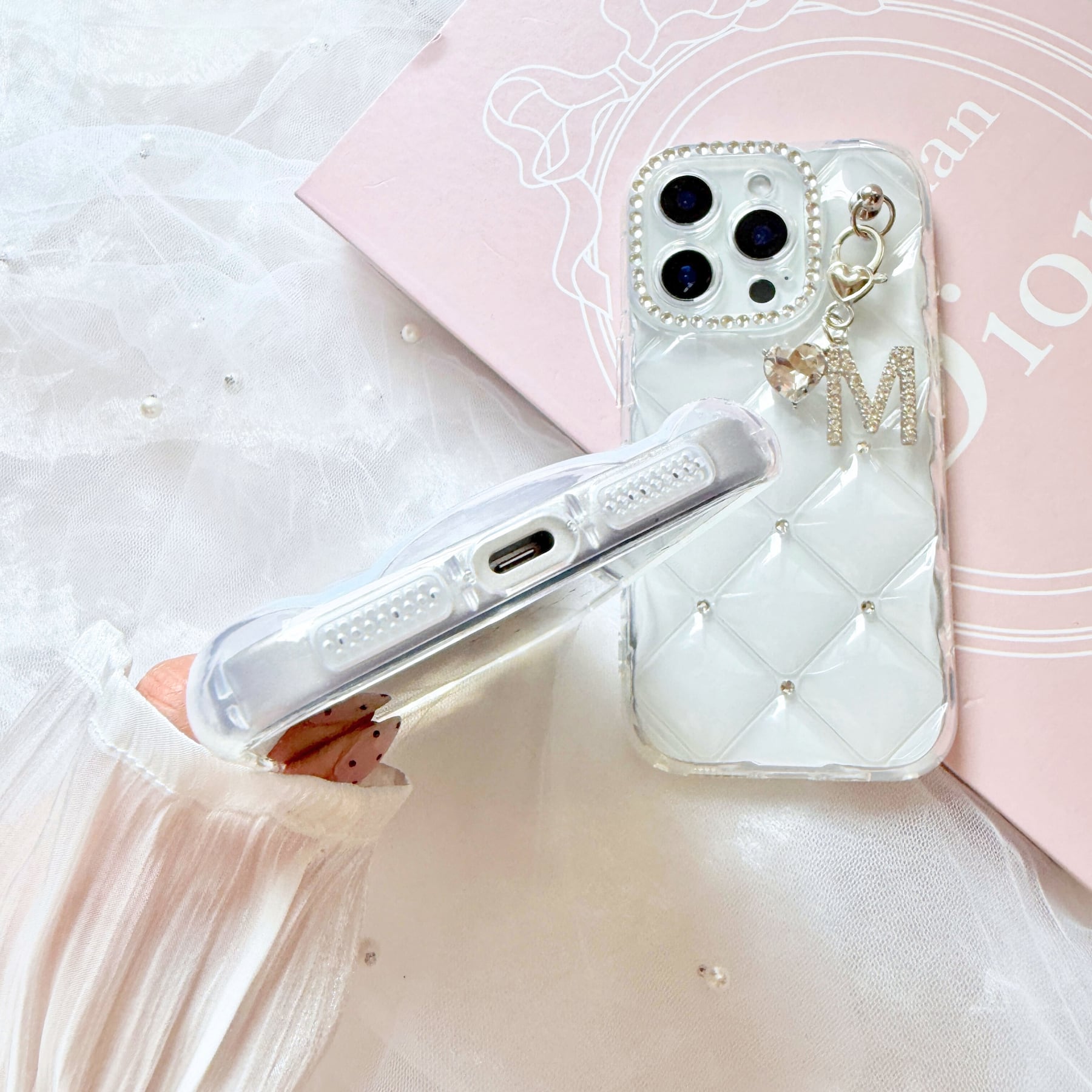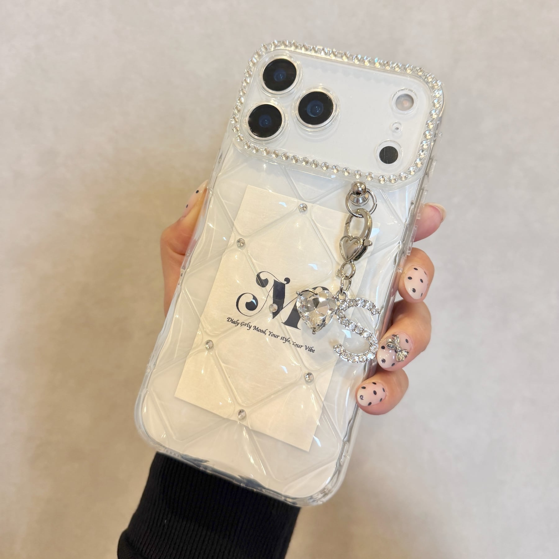 透明感のあるクリアベースに、繊細に輝くカメラフレームストーン。上品なきらめきが手元を美しく演出します。