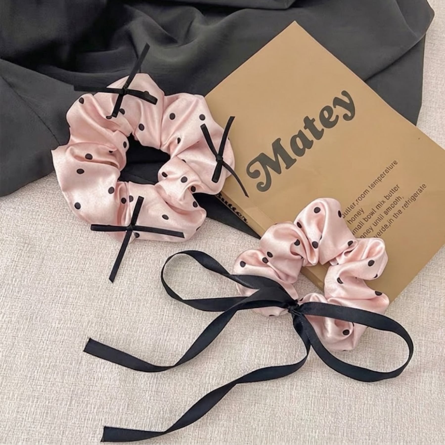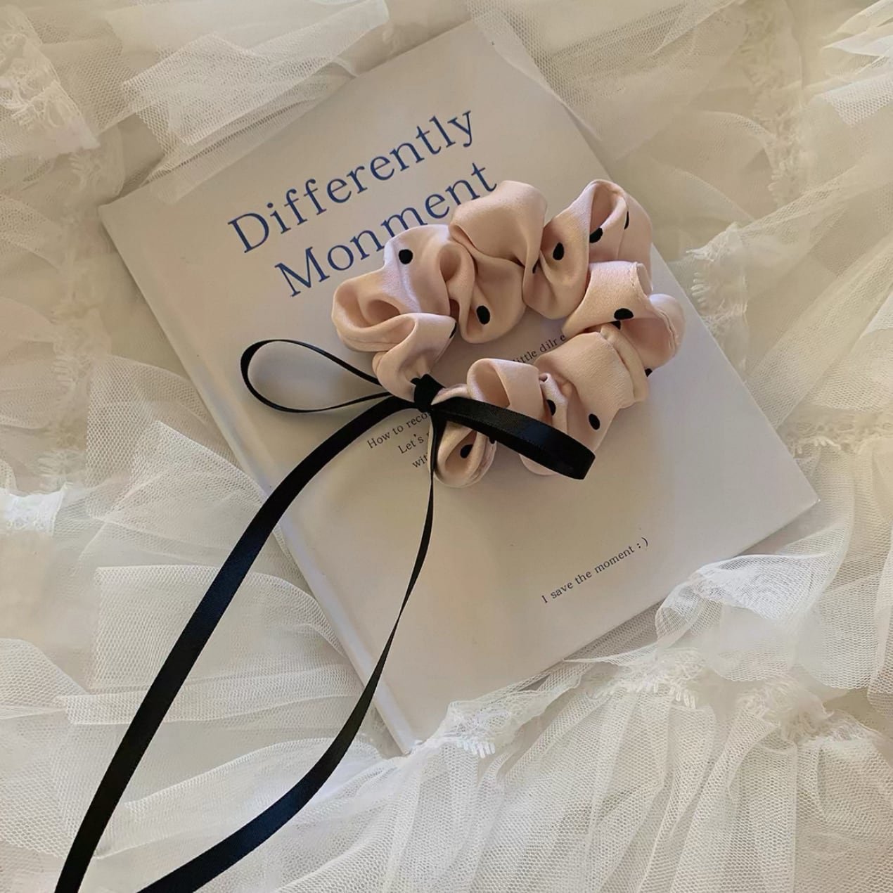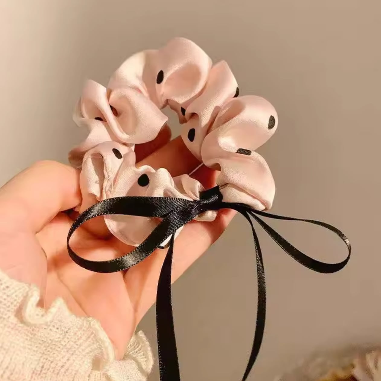 柔らかな光沢のあるピンクサテンに、クラシカルなドット柄をあしらったシュシュ。