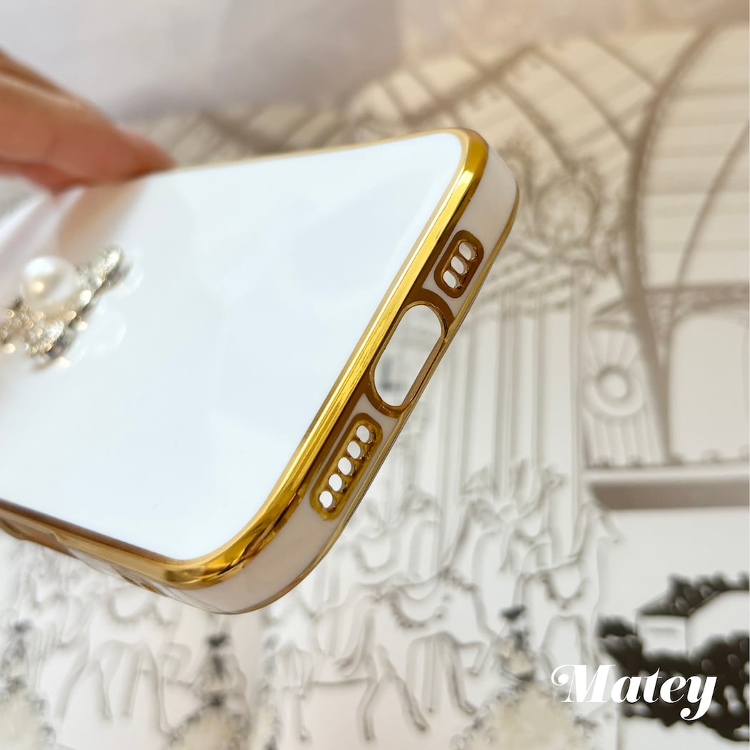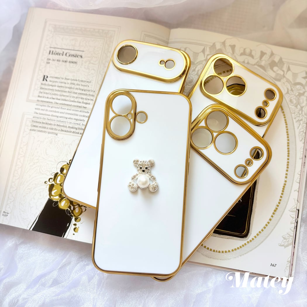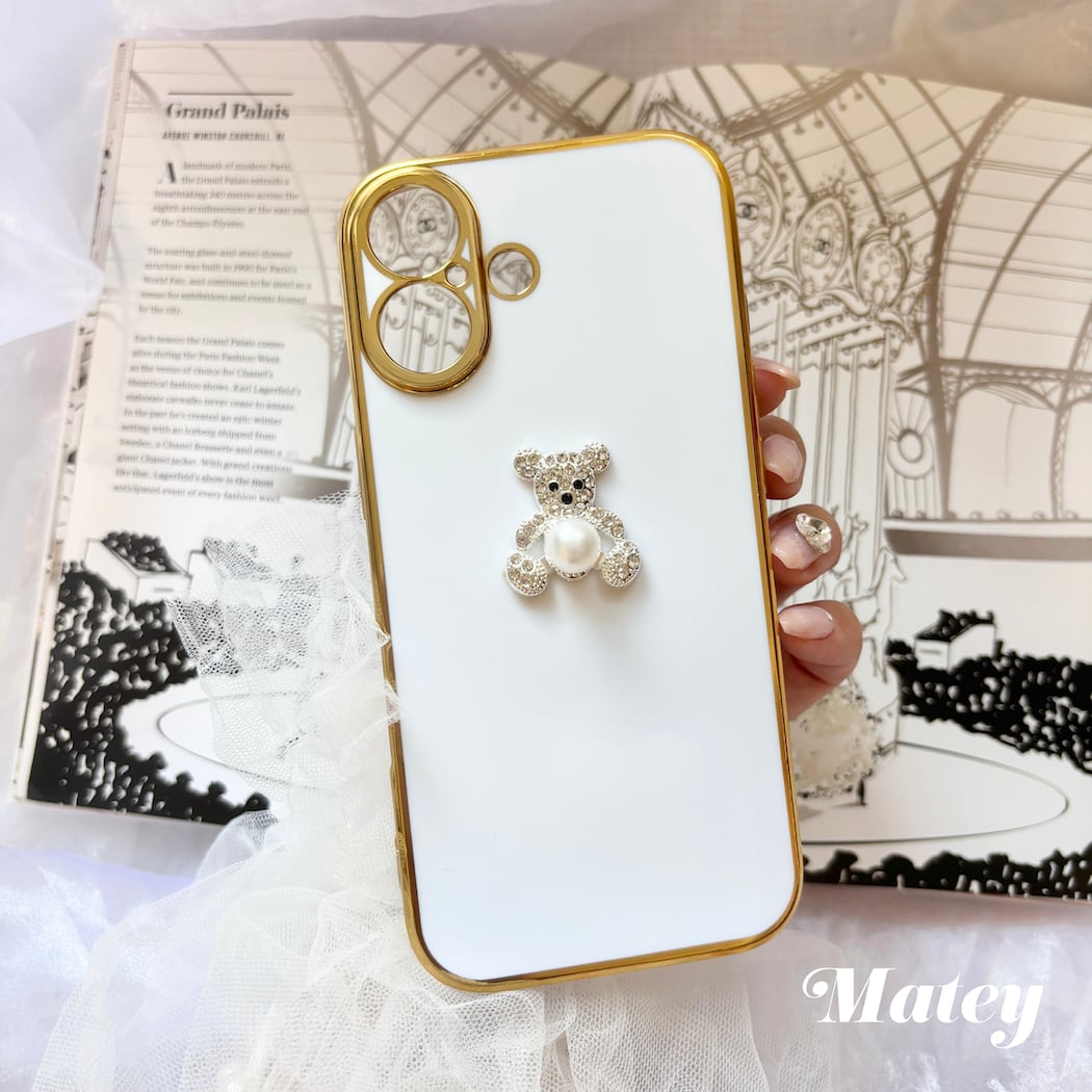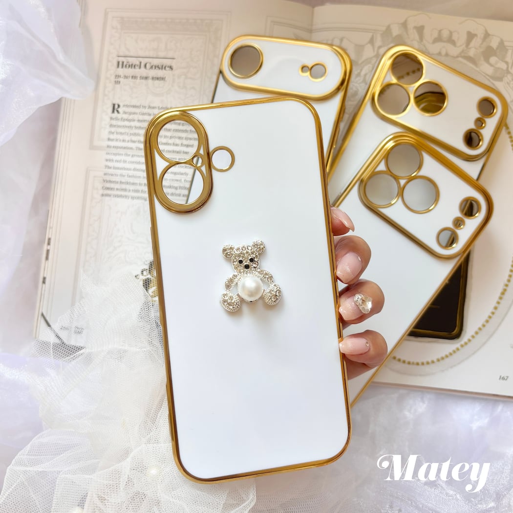きらめくビジューとパールを抱えたテディチャームが主役のiPhoneケース。