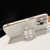 ホワイトデザインのiPhoneケースに、スクエアダイヤのスマホグリップで高級感◎