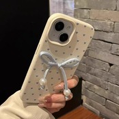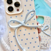 散りばめられたハート柄ドットに、揺れるアイスブルーリボンが甘く上品なデザインのiPhoneケースです♡